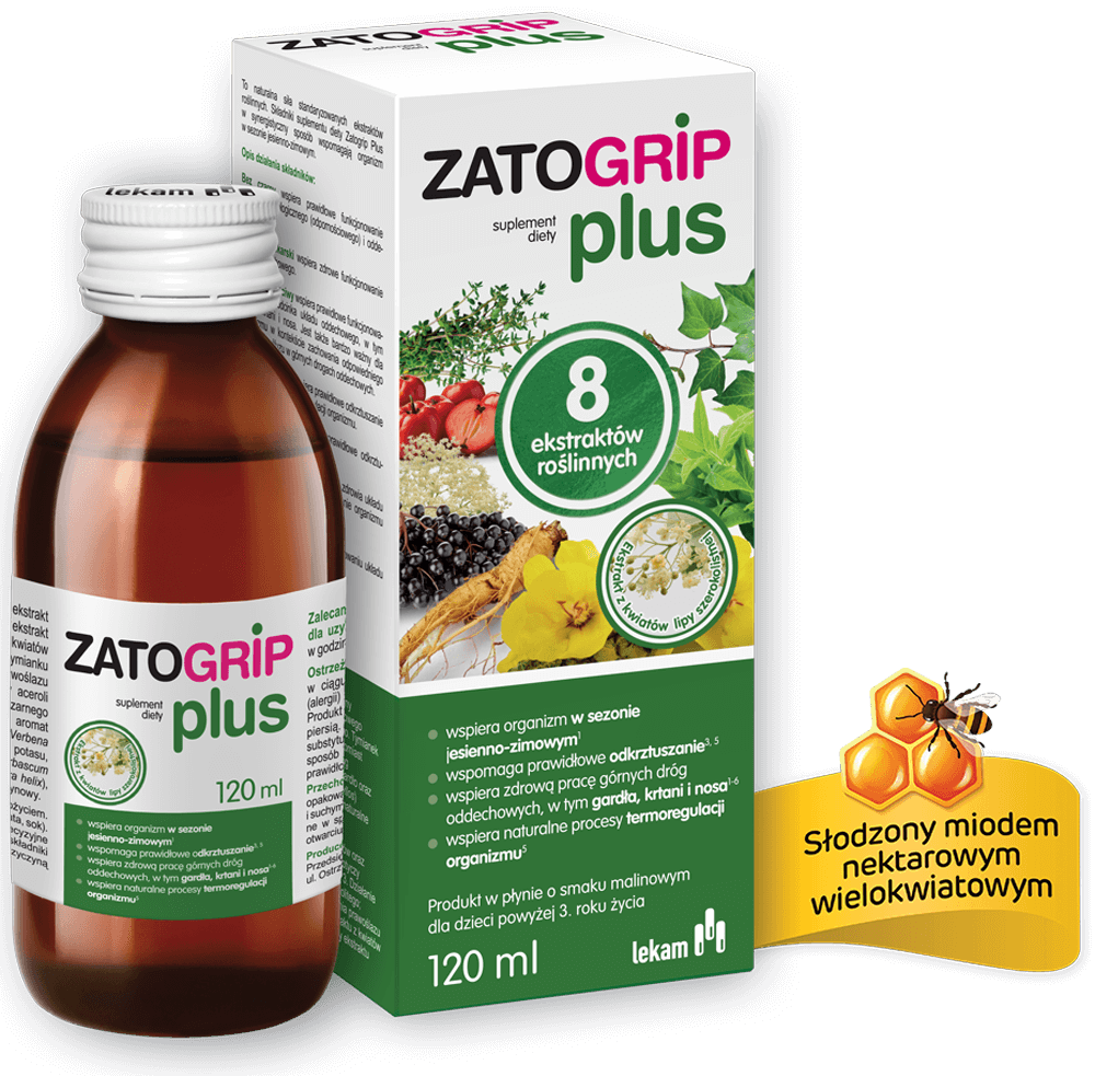 ZATOGRIP Plus wspiera prawidłowe funkcjonowanie układu oddechowego – w tym nosa, gardła i krtani – oraz układu odpornościowego. Wspiera prawidłowe odkrztuszanie i naturalną termoregulację organizmu.* To aż 8 ekstraktów roślinnych. Bogaty skład Zatogrip Plus oprócz ekstraktu z kwiatów lipy szerokolistnej zawiera ekstrakty z: owoców i kwiatów bzu czarnego, ziela tymianku właściwego, korzenia prawoślazu lekarskiego, owoców aceroli oraz ziela werbeny pospolitej, kwiatów dziewanny drobnokwiatowej, liści bluszczu pospolitego i dodatkowo cynk. To naturalna siła standaryzowanych ekstraktów roślinnych. Składniki suplementu diety Zatogrip Plus w synergistyczny sposób wspomagają organizm w sezonie jesienno-zimowym.